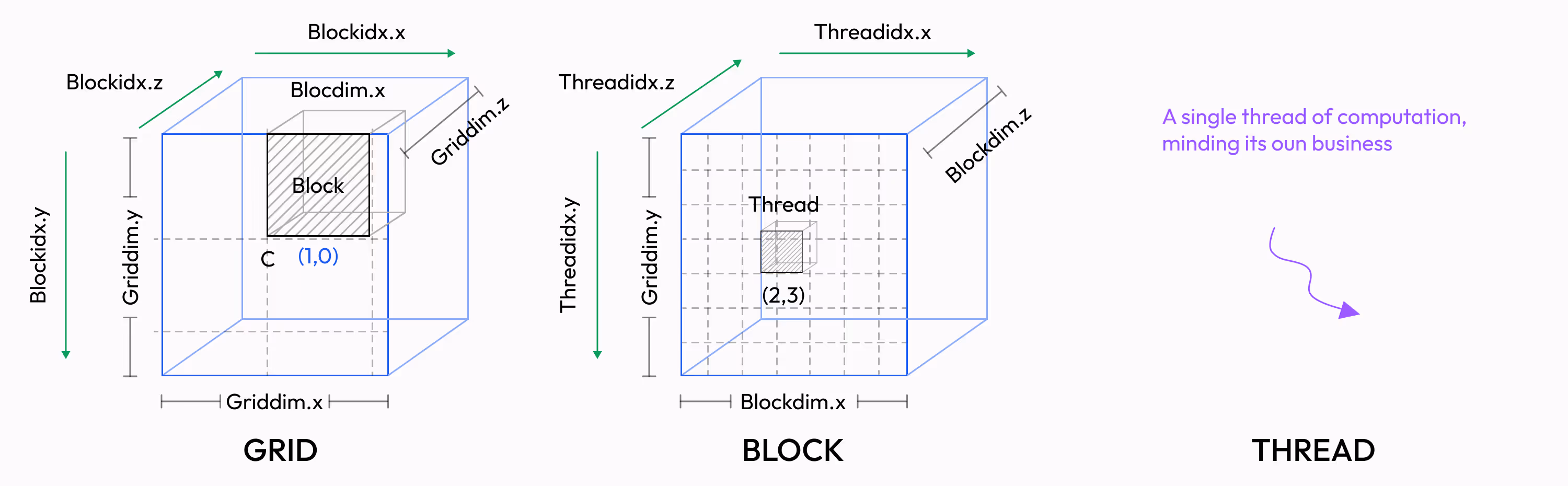 When blocks and threads are arranged in this 1D, 2D, or 3D layout, CUDA maps them to the x-axis, y-axis, and z-axis in its programming model. This will be useful in the next section.