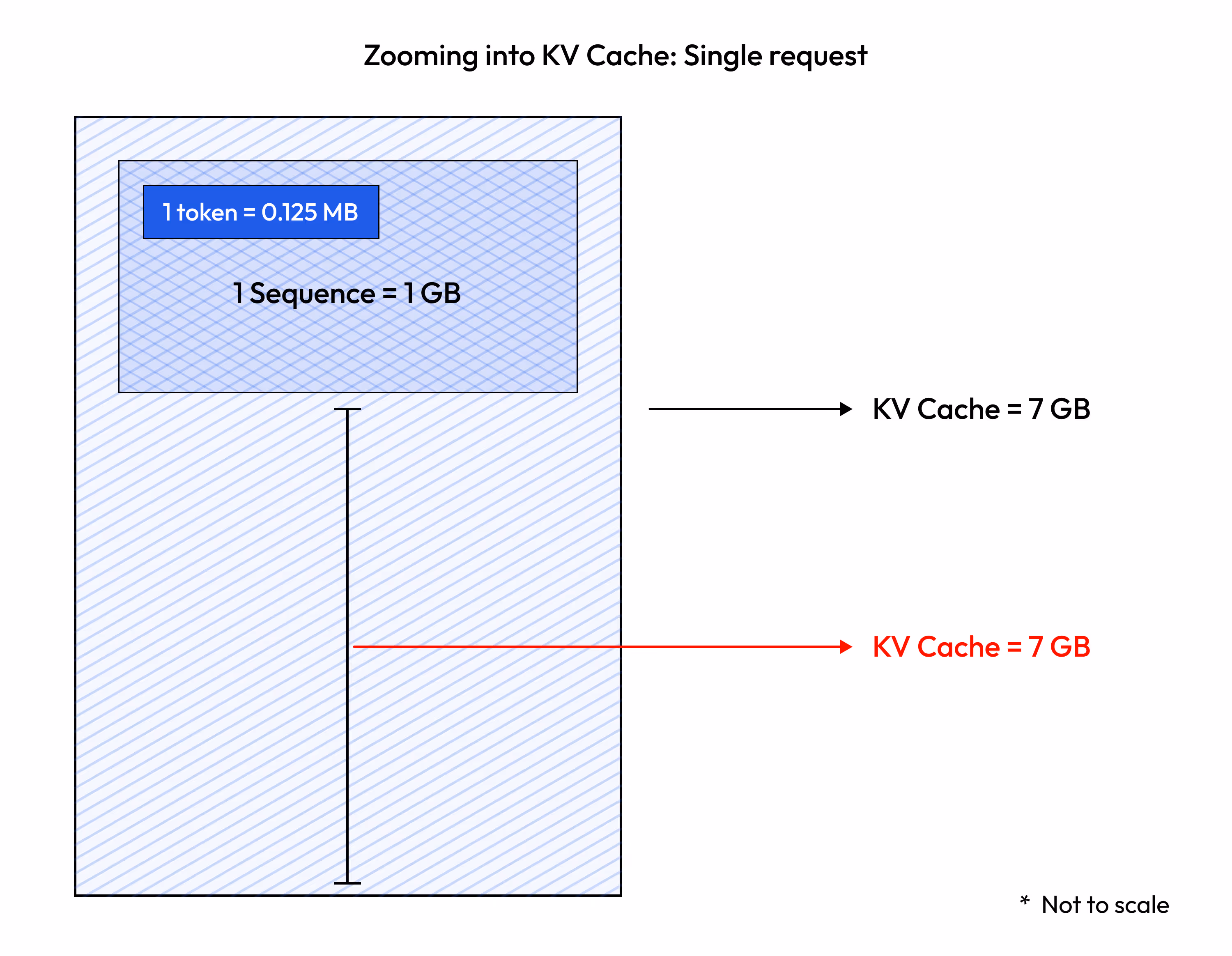 In our scenario, we would assume 8k as the context length to serve the model. Whenever a request arrives, the model computes the attention scores for all the prompt tokens and then generates one token at a time using autoregressive decoding. While decoding, it requires some VRAM on the GPU to store the token. A single token would take 0.125MB of VRAM to be stored in the KV cache.
