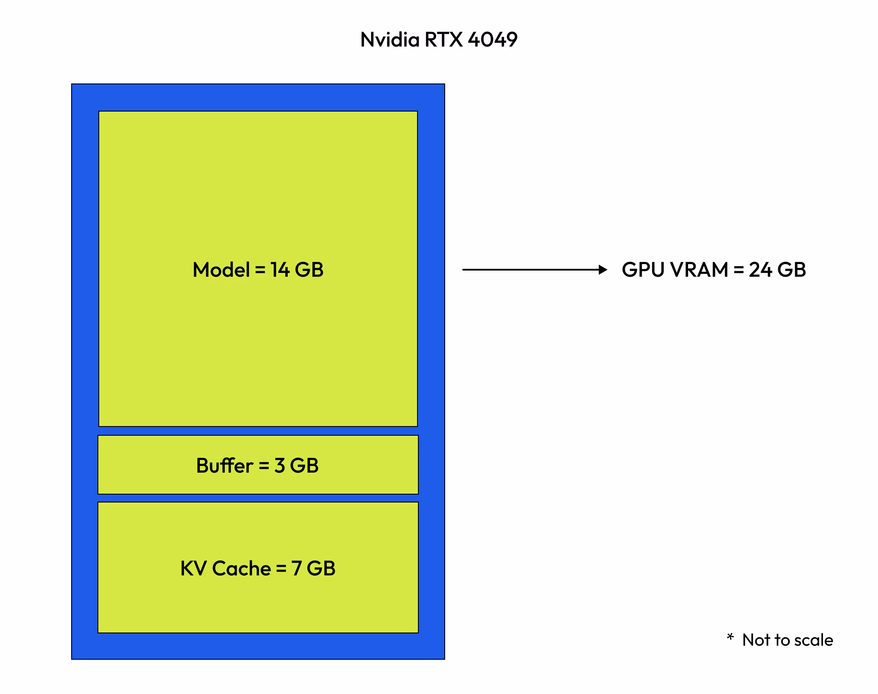 Taking real-world numbers around model sizes and GPU VRAM can help visualize and validate the workings of vLLM. Let us consider a case of deploying a Mistral 7B model on the highest-end consumer-grade GPU (Nvidia RTX 4090). If we choose to deploy the model at half-precision (FP 16, each parameter taking 2 bytes), the model would occupy ~14 GB of the VRAM from the available 24 GB VRAM on a 4090 GPU. Assuming an overhead of 3 GBs, the GPU would have 7 GB of VRAM available. This 7 GB of available VRAM will be reserved for the KV cache.
