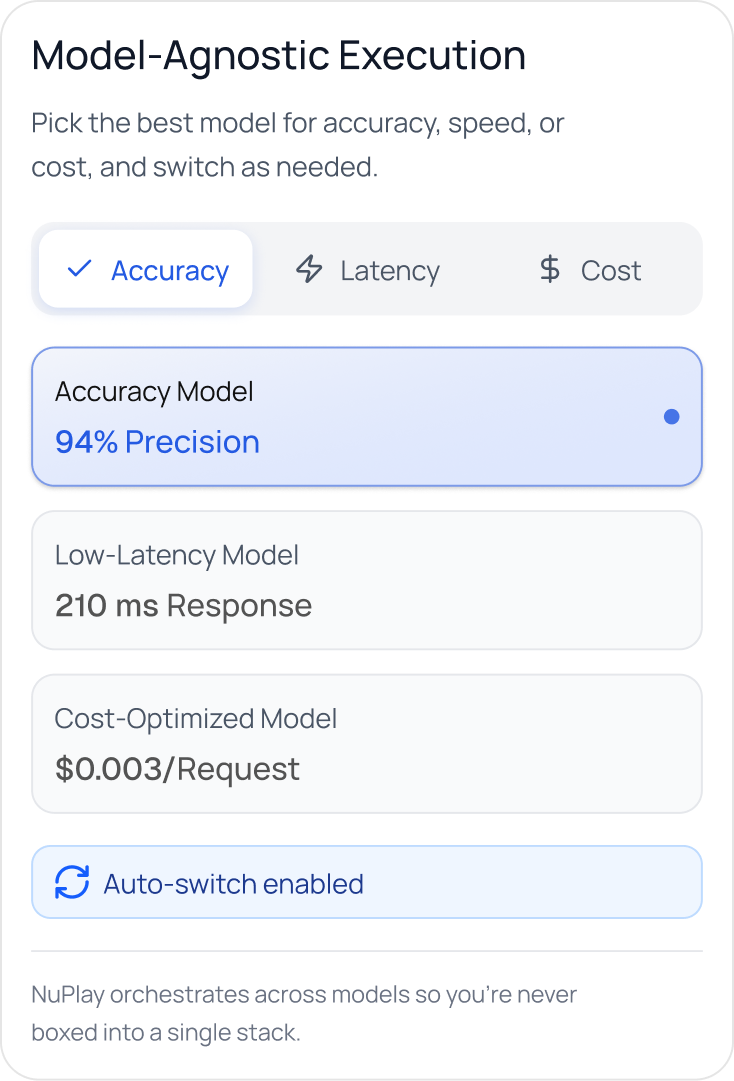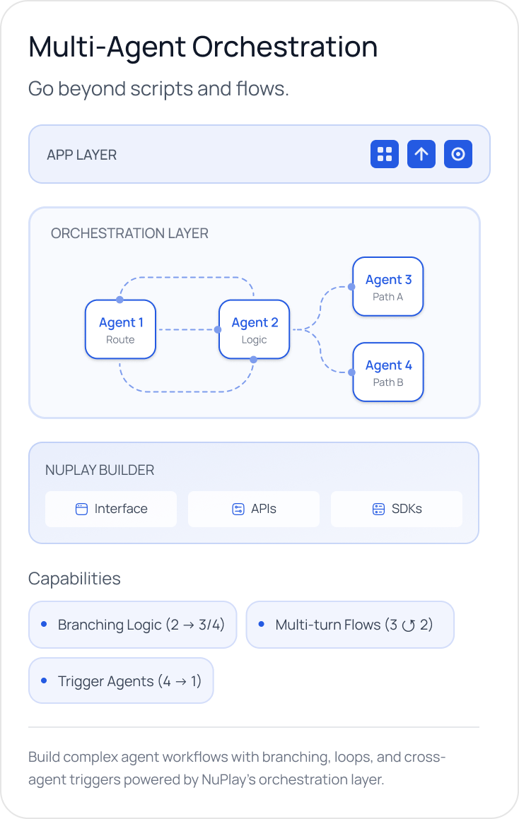 Most platforms stop at giving you building blocks, but NuPlay delivers real business outcomes by owning the orchestration. It acts as your expert implementation partner every step of the way.