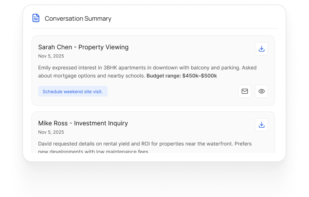 The AI agent collects key buyer information like budget, location, and timeline through natural dialogue. It qualifies leads in seconds based on set criteria and scores intent automatically. This helps your team focus only on high-value prospects ready to take action.